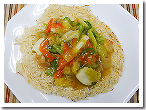 平たく形を整え弱火でじっくり焼き色がついたら裏返し焼く。(3)食べやすいように切れ目を入れお皿に盛る。(4)野菜は1cm幅に切り炒め塩コショウで味を調え混ぜておいたAを入れとろみがつくまで煮て麺にかける。